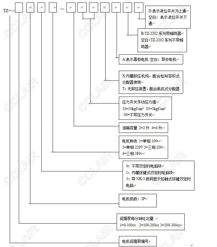 TZ-2232-410X 表示為單相220v配有NK-3型數(shù)顯微電腦、10kgf/cm2壓力開關(guān)、內(nèi)藏卸壓機構(gòu),4升油箱的TZ型潤滑泵。