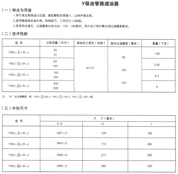 YWU-25*80-J,YWU-40*80-J,YWU-63*100-J,YWU-100*100-J,YWU-250*80-J,Y型油管路濾油器