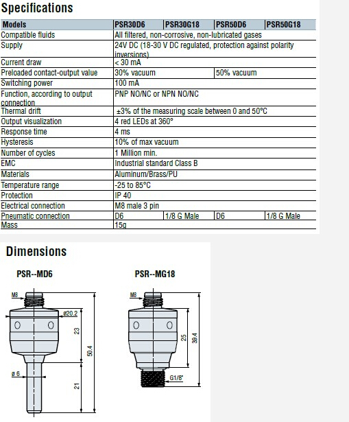 詳細信息 PSR30D6,PSR30G18,PSR50D6,PSR50G18,COVAL真空開關 由于其結構緊湊和超輕型設計,PSR系列真空開關安裝時應盡可能接近吸盤,以減少響應時間。