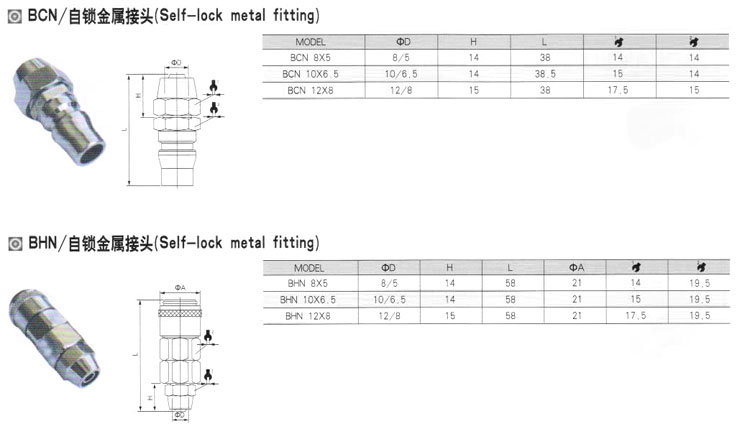 BCN8×5,BCN10×6.5,BCN12×8,BHN8×5,BHN10×6.5,BHN12×8,自鎖金屬接頭