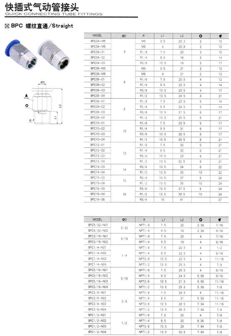 BPC04,BPC06,BPC08,BPC10,BPC12,BPC14,BPC15,BPC16,BPC5/32,BPC1/4,BPC3/8,BPC1/2,快插式氣動管接頭