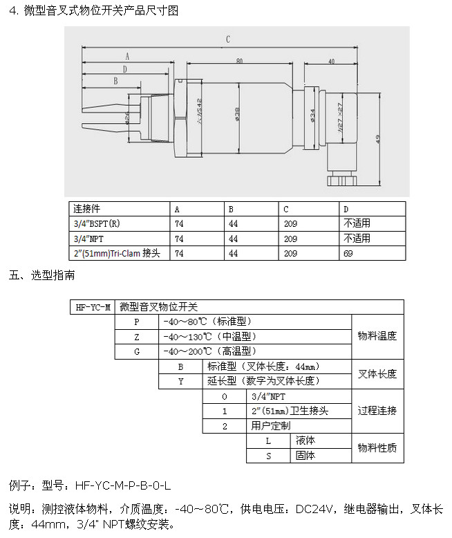 HF-YC-微型音叉式物位開關是一種新型的物位開關。本產品是一種采用音叉原理設計的液點液位開關。它是一種緊湊開關,配備耐用的不銹鋼本體和音叉,可用于各種液體應用場合。3/4”或 1”經濟型液位開關通過螺紋安裝與管道或儲罐上,或者通過衛(wèi)生連接件安裝于食品工業(yè)設施。直接負荷開關適用于所有電源或PNP輸出,用于可編程邏輯控制器 (PLC)的直接接口。提供防止溢出認證,僅適用于安全區(qū)域。