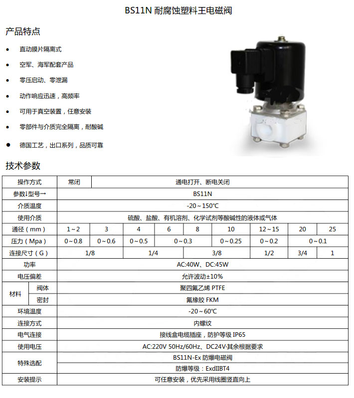 詳細信息 BS11N-DN1,BS11N-DN2,BS11N-DN3,BS11N-DN4,BS11N-DN6,耐腐蝕塑料王電磁閥