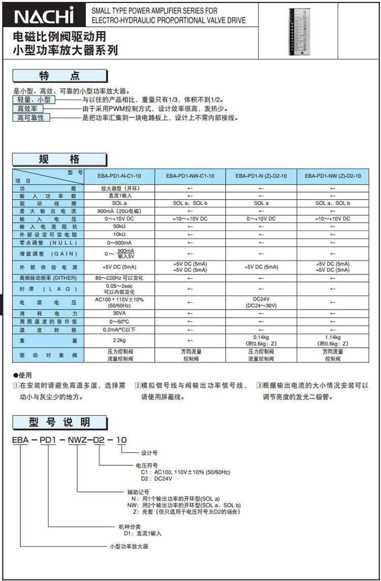 詳細信息 EBA-PD1-N-C1-10,EBA-PD1-NW-C1-10,EBA-PD1-NWZ-D2-10,EBA-PD1-Z-D2-10,NACHI小型比例放大器