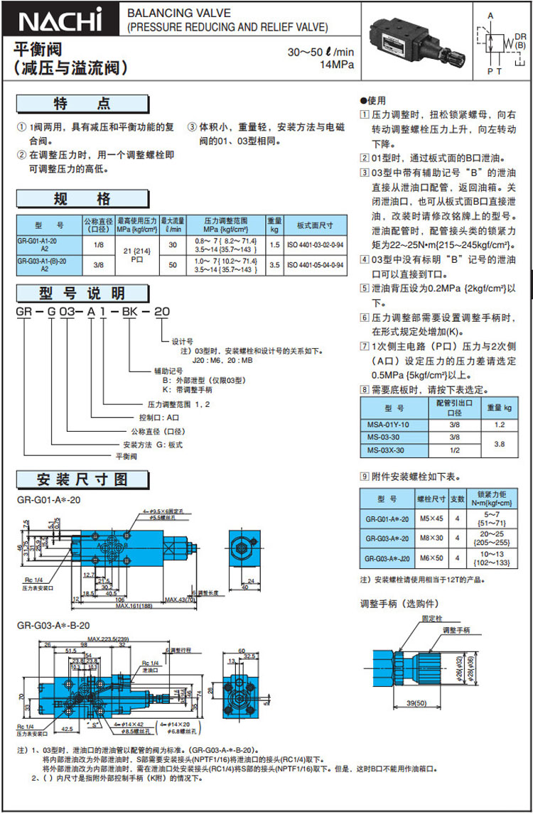 GR-G01-A1-20,GR-G01-A2-20,GR-G03-A1-20,GR-G03-A2-20,GR-G03-A1-B-20,GR-G03-A2-B-20,NACHI平衡閥