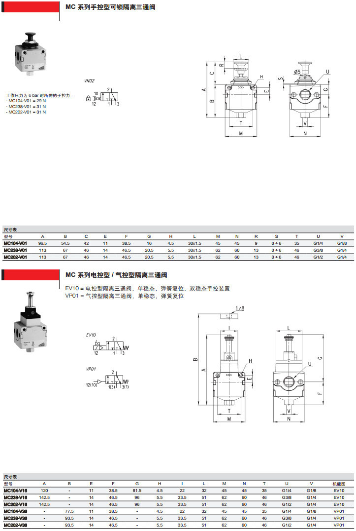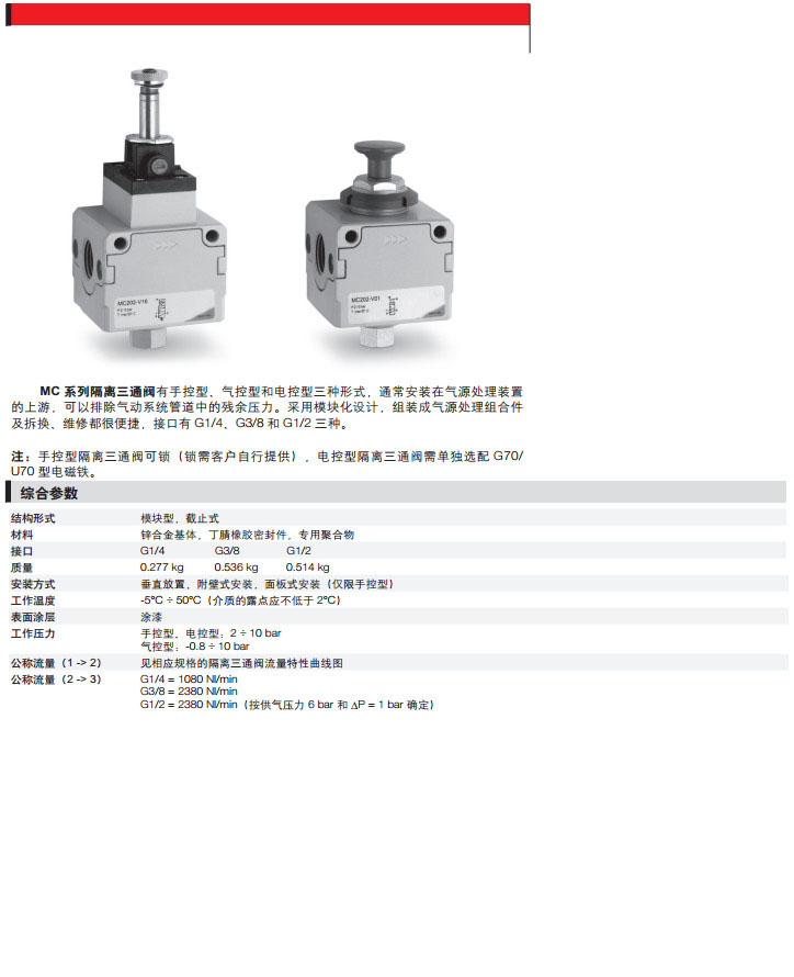 MC104-V16,MC138-V16,MC102-V36,MC204-V36,MC238-V01,MC202-V01,camozzi隔離三通閥