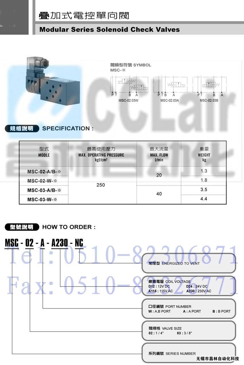 | MSC-03-W-A230-NC, | 疊加式電控單向閥 | |