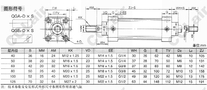詳細信息 QGA2-40,QGA2-50,QGA2-63,QGA2-80,QGA2-100,QGA2-125,雙作用雙活塞桿氣缸