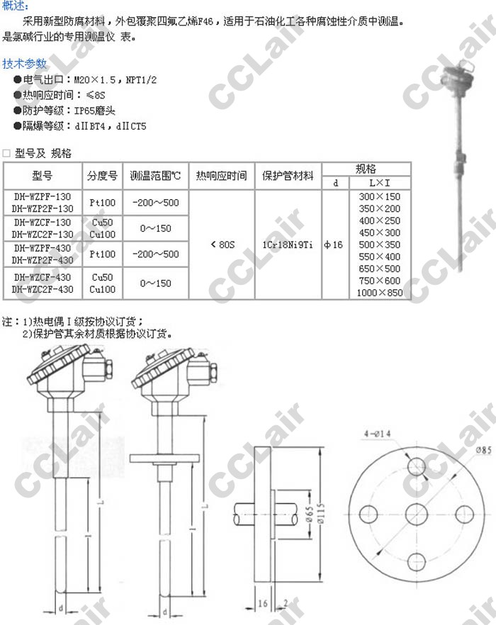 詳細信息 DH-WZPF-130,DH-WZP2F-130M,DH-WZC2F-130,DH-WZPF-430,DH-WZCF-430,防腐熱電阻