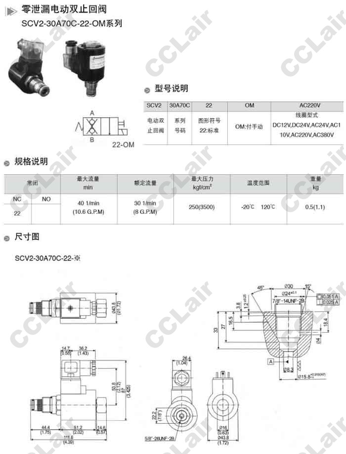 SCV-30A70C-22-OM-DC12V,SCV-30A70C-22-OM-DC24V,SCV-30A70C-22-OM-AC24V,零泄漏電動止回閥