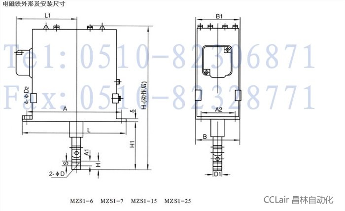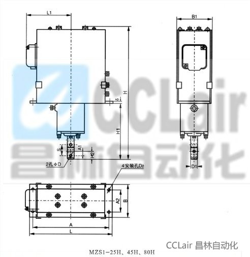三相交流長行程制動電磁鐵,其外殼除MZS1-80H外都用鋼板焊接而成。且MZS1-25H、45H及80H三種又具有緩沖裝置。