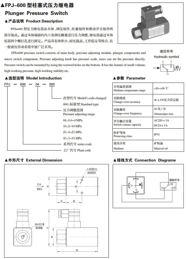 詳細(xì)信息 FPJ-600-04,FPJ-600-10,FPJ-600-25,FPJ-600-35,柱塞式壓力繼電器
