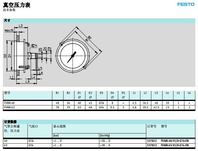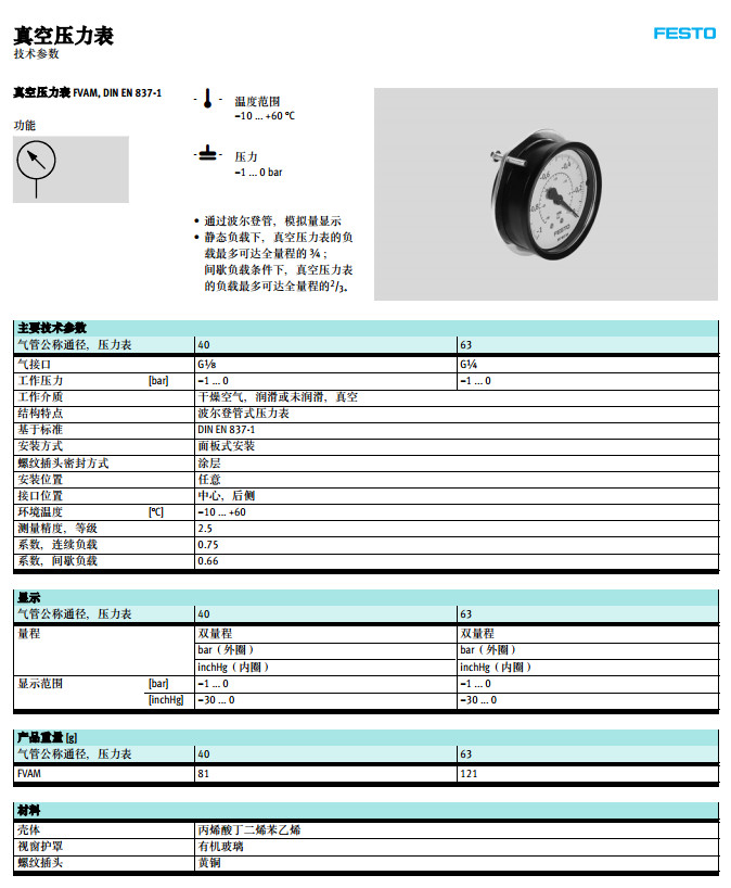 FVAM-40-V1/0-G1/8-EN,FVAM-63-V1/0-G1/4-EN,festo真空壓力表