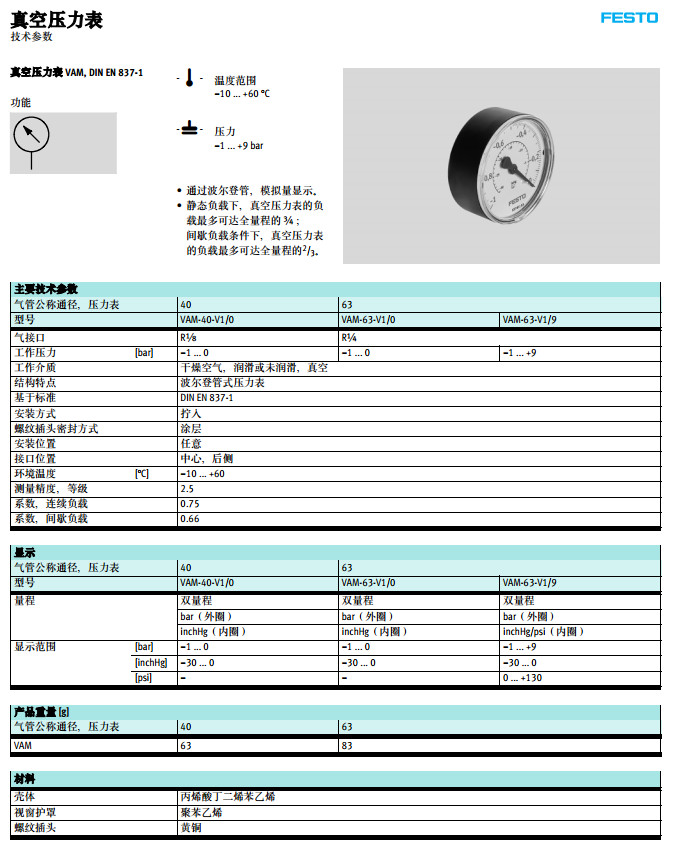 VAM-40-V1/0,VAM-63-V1/0,VAM-63-V1/9,festo真空壓力表