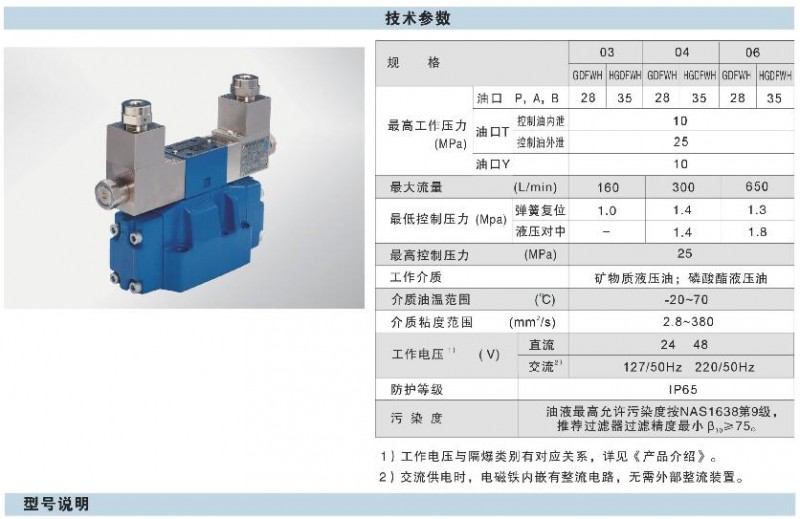 二、技術(shù)參數(shù):規(guī)格 06 10 最高工作壓力 (MPa) 31.5 最大流量 (L/min) 220 430 工作介質(zhì) 礦物質(zhì)液壓油;磷酸脂 介質(zhì)油溫范圍 (℃) -20~70 介質(zhì)粘度范圍 (mm2/s) 2.8~380 開啟壓力 (MPa) a:0.05 b:0.4 工作電壓 (V) 直流 24 *交流 127, 220 防護(hù)等級 IP55