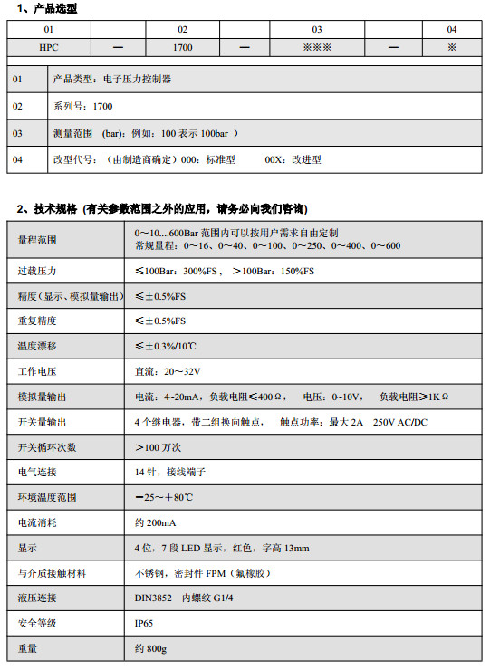 詳細信息 HPC-1700-16,HCP-1700-40,HCP-1700-100,HCP-1700-250,HCP-1700-400,HCP-1700-600智能電子壓力控制器