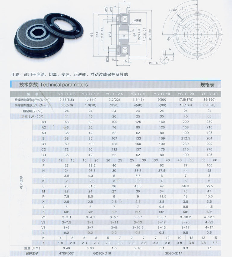 YS-C-0.6,YS-C-1.2,YS-C-2.5,YS-C-5,YS-C-10,YS-C-20,YS-C-40,干式單板電磁離合器