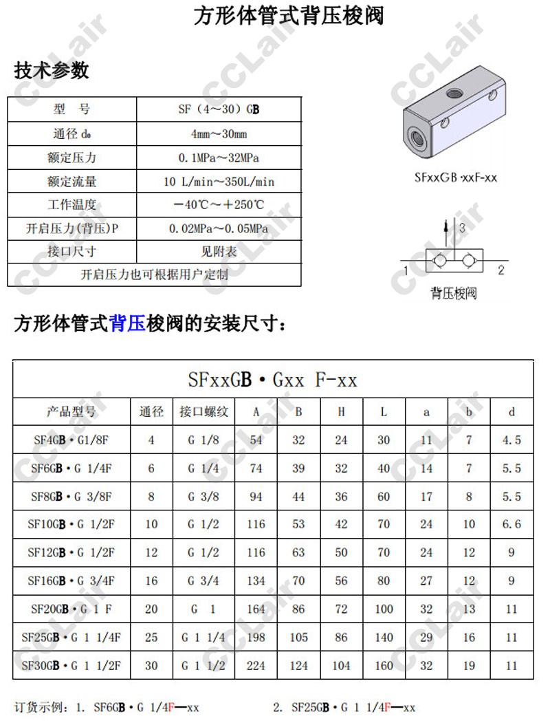SF4GB,SF6GB,SF8GB,SF10GB,SF12GB,SF16GB,SF20GB,SF30GB,SF4GB-G1/8F,SF30GB-G1 1/2F,方形體管式背壓梭閥