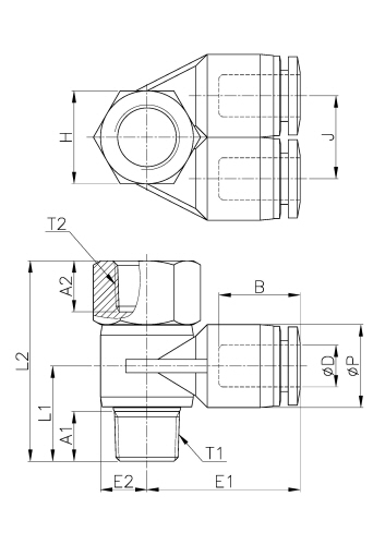 Model ¢D  ¢P  T1 T2 L1 L2 J E1 E2 A1 A2 B H(Hex) ORIFICE WEIGHT(g) BOX(EA)