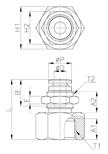 | Model | ¢D | ¢P | T1 | T2 | L | E | A1 | A2 | B | H1(Hex) | H2(Hex) | ORIFICE | WEIGHT(g) | BOX(EA) |