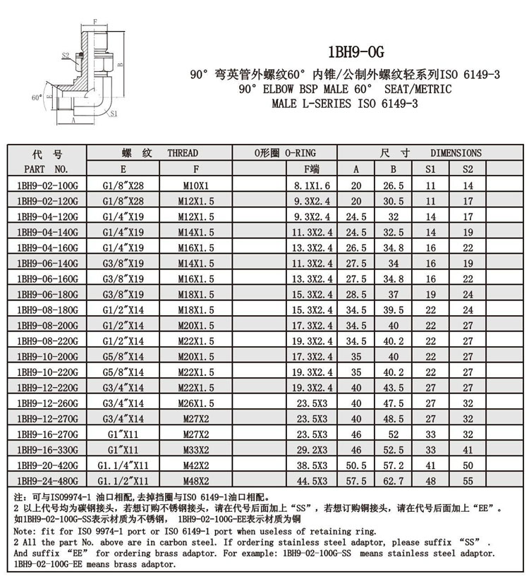 詳細信息 1BH9-02-100G,1BH9-02-120G,1BH9-04-120G,1BH9-04-140G,1BH9-04-160G,1BH9-06-140G,錐面密封接頭