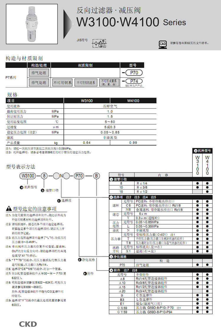 詳細信息 W3100-8,W3100-10,W4100-8,W4100-10,W4100-15,CKD過濾減壓閥