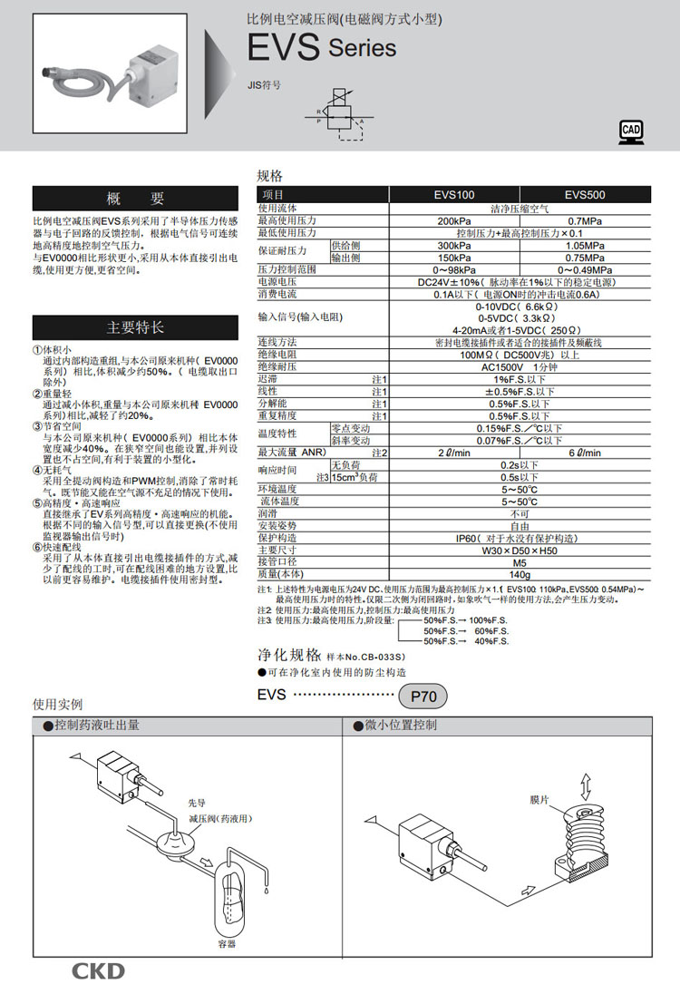 詳細信息 EVS100-0M5,EVS100-1M5,EVS100-2M5,EVS500-0M5,EVS500-1M5,EVS500-2M5,CKD比例電控減壓閥