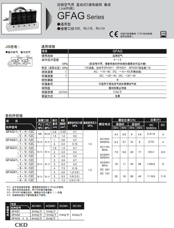 GFAG11-Y-2-12C,GFAG21-Z-2-12C,GFAG31-0-2-12C,GFAG41-1-2-12C,GFAG51-1-2-12C,CKD直動式3通電磁閥