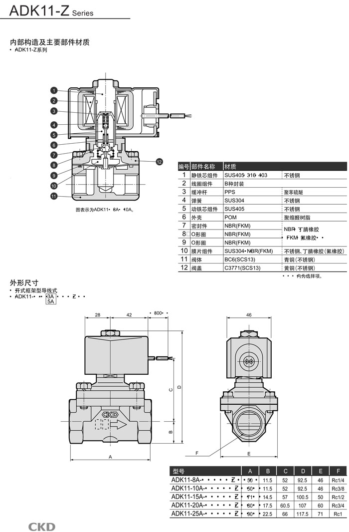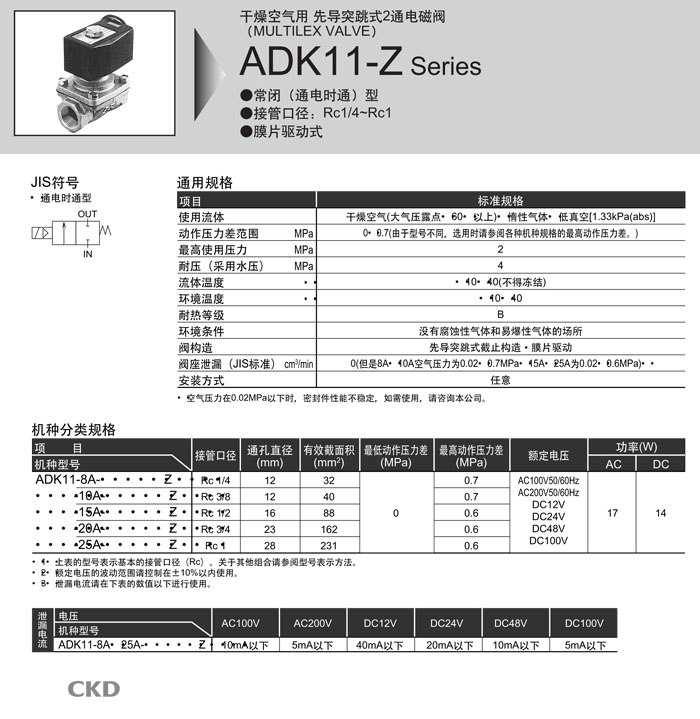 詳細信息 ADK11-8A,ADK11-10A,ADK11-15A,ADK11-20A,ADK11-25A,CKD先導式式2通電磁閥