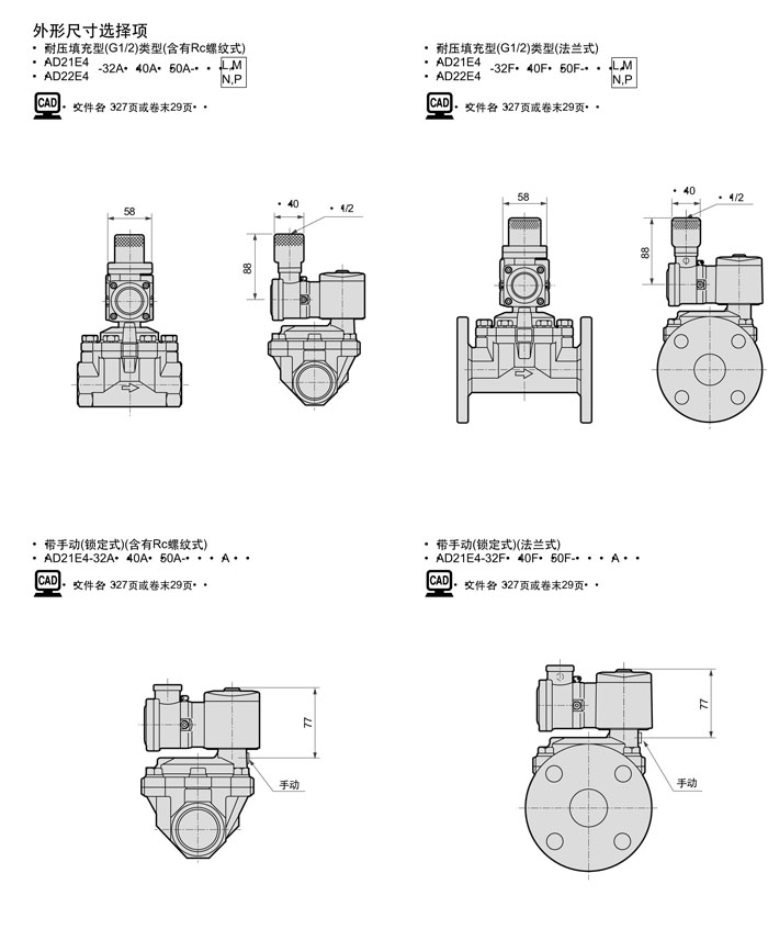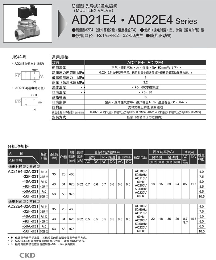 AD22E4-32A,AD22E4-32F,AD22E4-40A,AD22E4-40F,AD22E4-50A,AD22E4-50F,CKD先導(dǎo)式2通電磁閥