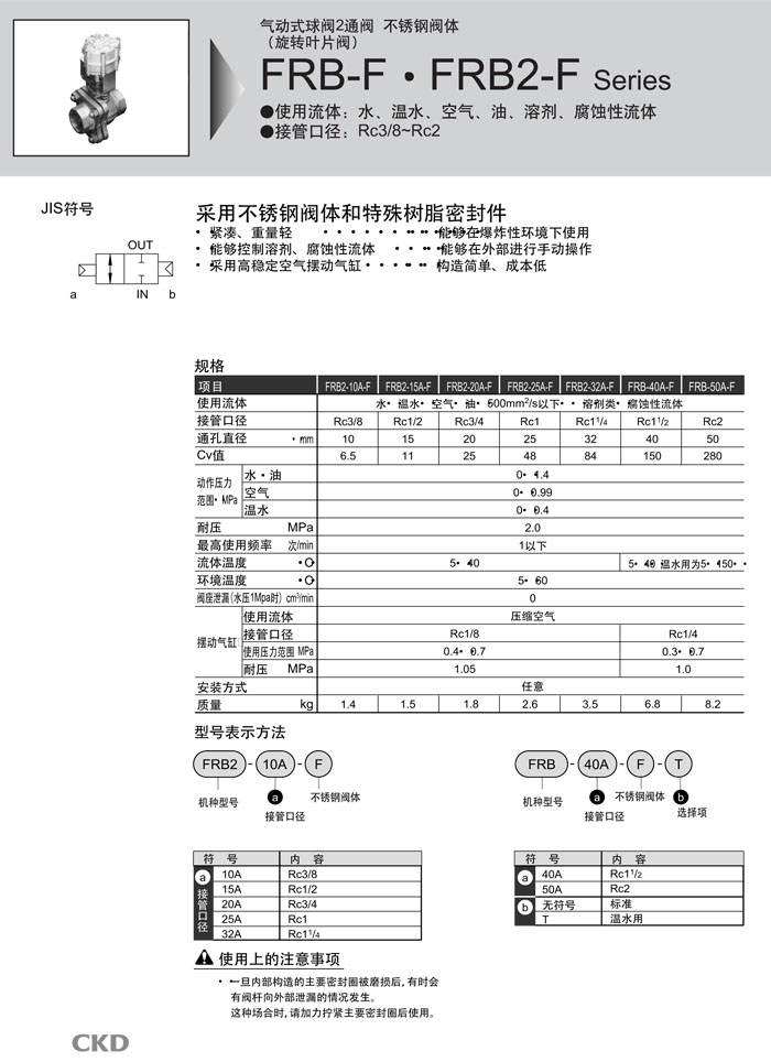 FRB2-10A-F,FRB2-15A-F,FRB2-20A-F,FRB2-25A-F,FRB2-32A-F,FRB-40A-F,FRB-50A-F,CKD氣動式球閥2通閥