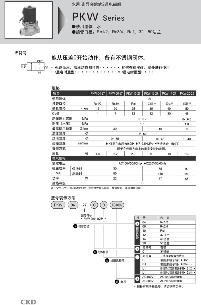 PKW-04-27,PKW-06-27,PKW-10-27,PKW-12-27,PKW-14-27,PKW-20-25,CKD先導式2通電磁閥