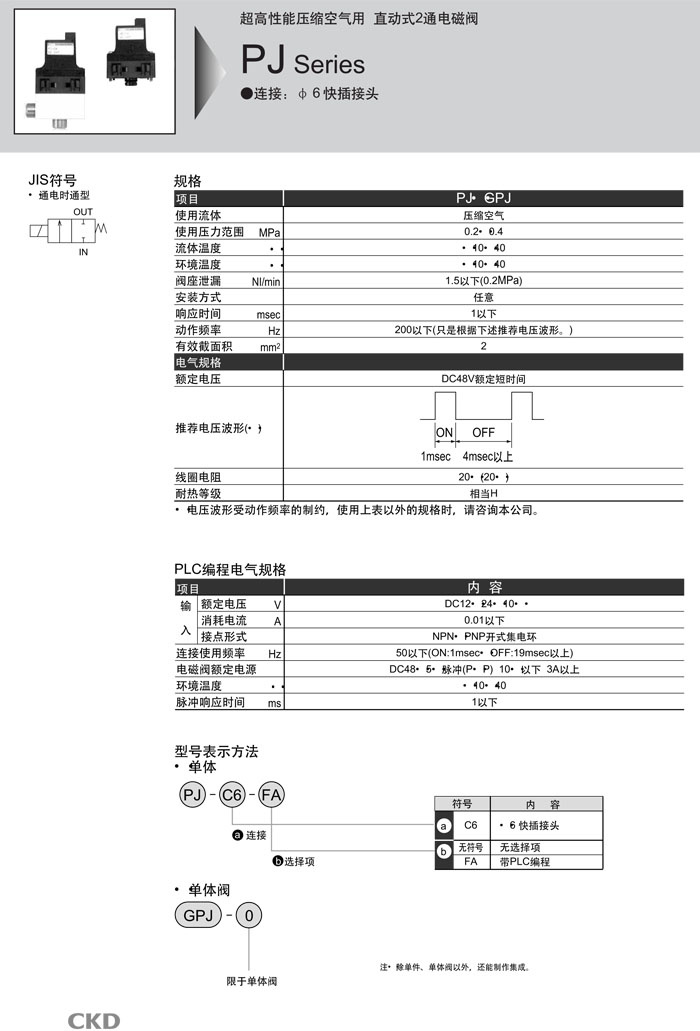 PJ-C6-FA,PJ-C6,GPJ-0,CKD直動(dòng)式2通電磁閥