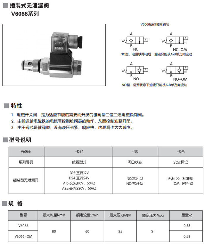 V6066-D12,V6066-D24,V6066-A15,V6066-A25,V6066-D12-NO-OM,V6066-A25-NC,插裝式無(wú)泄漏閥