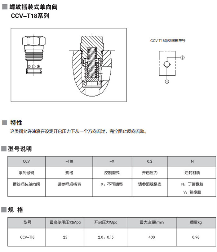 CCV-T18-X2.0N,CCV-T18-X2.0V,螺紋插裝式單向閥