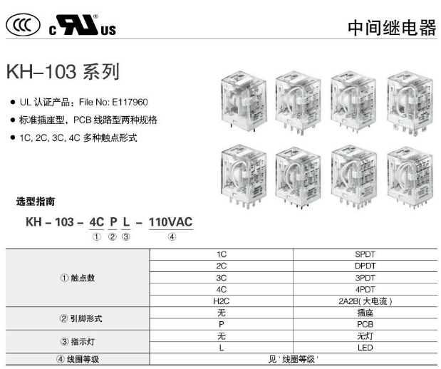 KH-103-1C,KH-103-2C,KH-103-3C,KH-103-4C,KH-103-H2C,KH-103-1CP,KH-103-2CPL,Koino中間繼電器