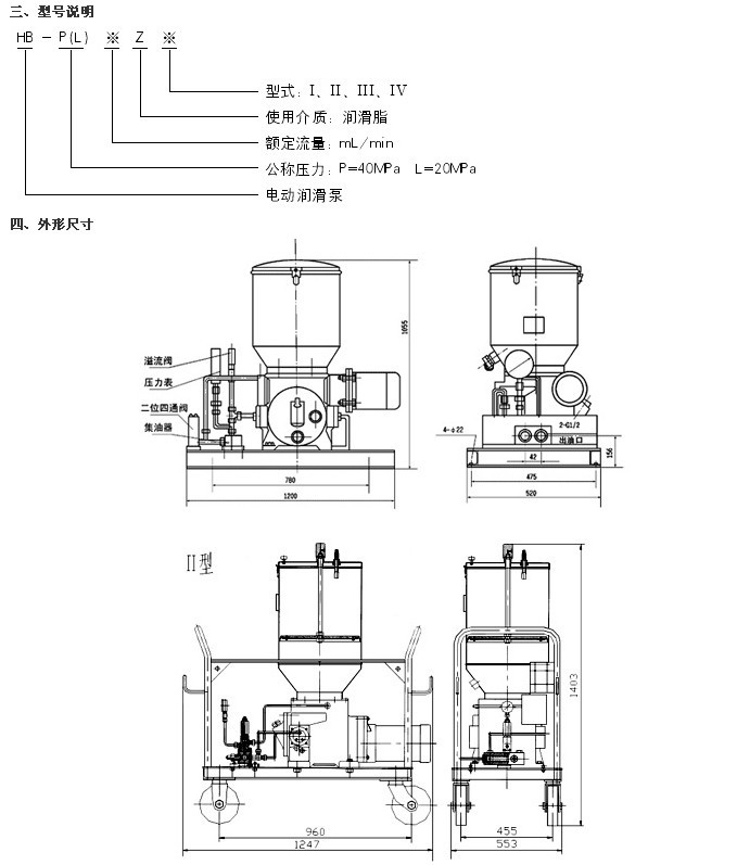 HB-P系列電動(dòng)潤滑泵適用于潤滑點(diǎn)多、分布范圍廣、給油頻率高、公稱壓力為40(20MPa)的單、雙線干(稀)油集中潤滑系統(tǒng)中,作為供送潤滑劑的裝置,還可配備移動(dòng)小車、膠管、油槍及電纜組成移動(dòng)式電動(dòng)潤滑泵裝置以便用于給油頻率低,潤滑點(diǎn)少,給油量大且不便于采用集中潤滑的單機(jī)設(shè)備,進(jìn)行移動(dòng)給油,貯油桶還設(shè)有油位自動(dòng)報(bào)警裝置,如配以相應(yīng)的電氣控制箱還可實(shí)現(xiàn)自動(dòng)控制,并對系統(tǒng)進(jìn)行監(jiān)視。