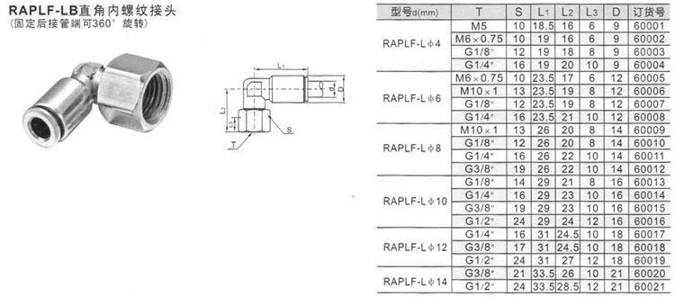 詳細信息 RAPLF-L4,RAPLF-L6,RAPLF-L8,RAPLF-L10,RAPLF-L12,RAPLF-L14,直角內(nèi)螺紋接頭