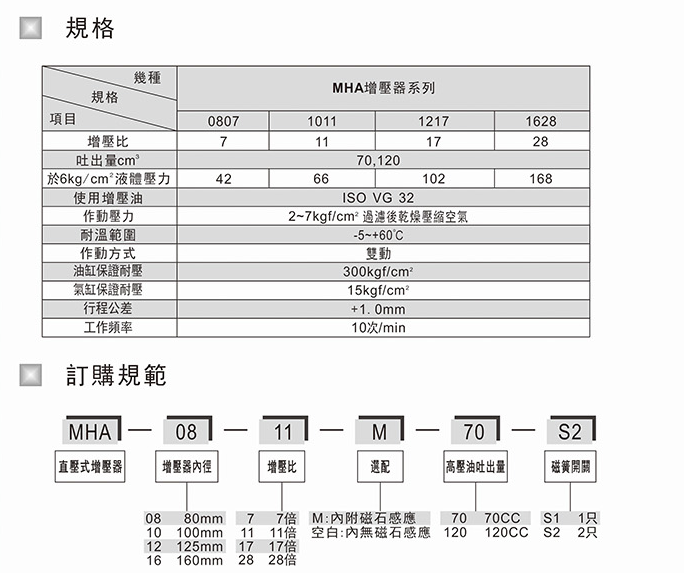直壓式增壓器 MHA-0807-M-70-S1,MHA-0807-M-70-S2,MHA-0807-M-120-S1,MHA-0807-M-120-S2,MHA-0807-70-S1
