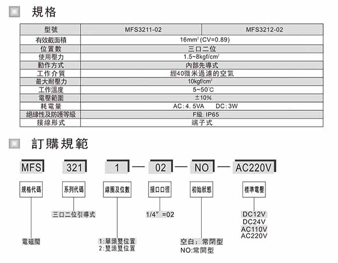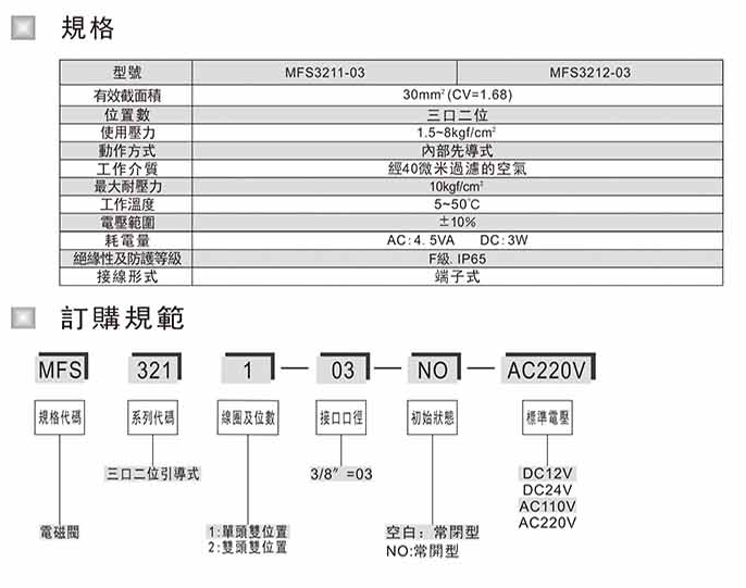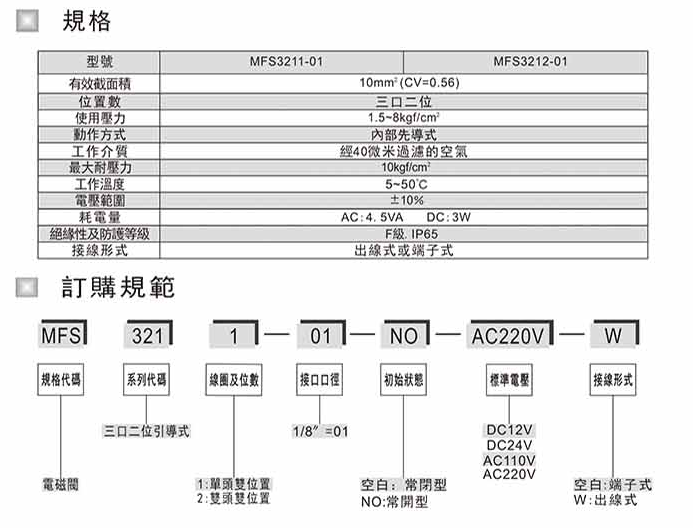 電磁閥 MFS3211-01-NO-DC12V,MFS3211-01-NO-DC24V,MFS3211-01-NO-AC110V,MFS3211-01-NO-AC220V