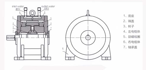 左右電樞體(帶有渦流環(huán))中設(shè)置有相同的冷卻水路,勵(lì)磁線圈裝在兩個(gè)電樞體之前,冷卻水從進(jìn)水口進(jìn)入后經(jīng)電樞體下半部進(jìn)入渦流環(huán)冷卻水槽中,然扣從電樞體的上半部流進(jìn)出水口,通過出水口流出。