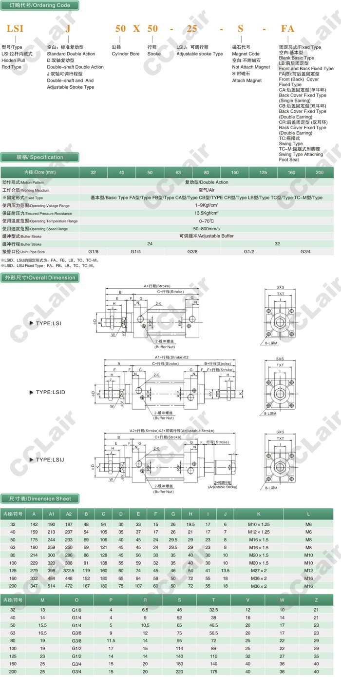 LSI32,LSI40,LSI50,LSI63,LSI80,LSI100,LSI125,LSI150,LSI200,LSI200×50,LSI50×50,標(biāo)準(zhǔn)氣缸 |