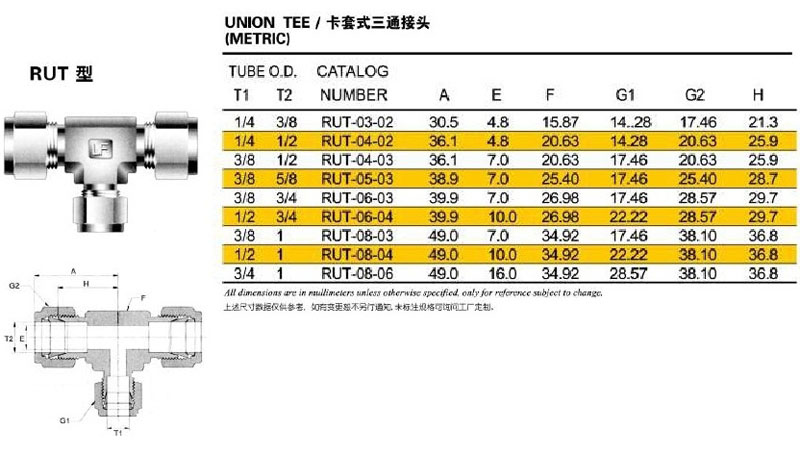 詳細信息 RUT-03-02,RUT-04-02,RUT-04-03,RUT-05-03,RUT-06-03,RUT-06-04,卡套式三通接頭