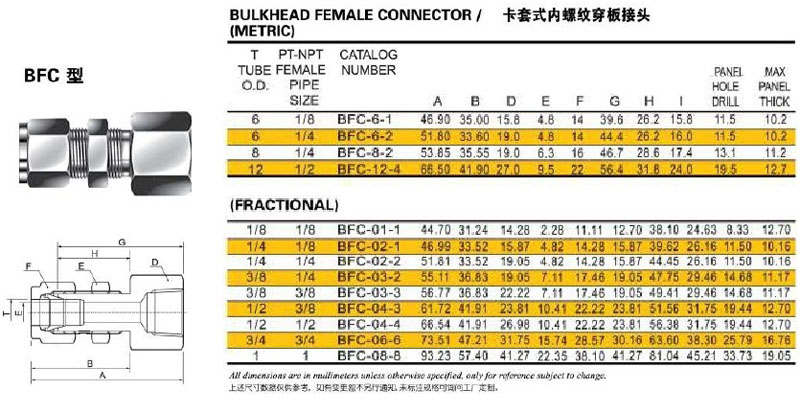 詳細信息 BFC-6-1,BFC-6-2,BFC-8-2,BFC-12-4,BFC-01-1,BFC-02-1,BFC-02-2,卡套式內(nèi)螺紋穿板接頭
