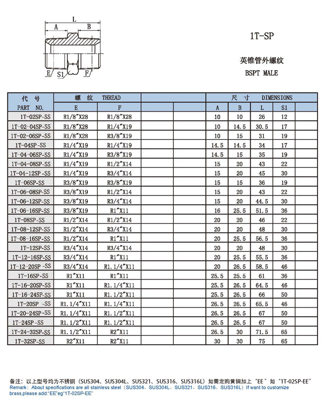 1T-02SP-SS,1T-04SP,1T-06SP,1T-08SP,1T-16SP,1T-20SP,1T-32SP,直通外絲接頭