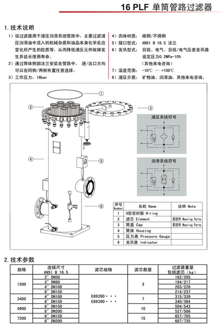 型號: 16PLF15,16PLF34,16PLF49,16PLF72,16PLF15T2602KN3,16PLF34T2604KN3,16PLF49T2608KN3,單筒管路過濾器