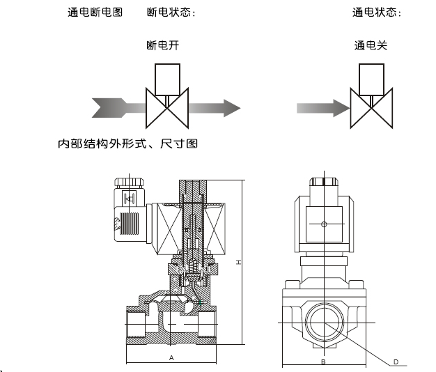 二位二通常型電磁閥,斷電打開,通電關(guān)閉閥體材質(zhì)為銅,最大耐壓:12kgf/cm2環(huán)境溫度:0℃~65℃產(chǎn)品系列化生產(chǎn),體積小,流量大,適用范圍廣按閥上所表流向箭頭,可任意安裝;為增強(qiáng)使用壽命,最好線圈向上,水平安裝