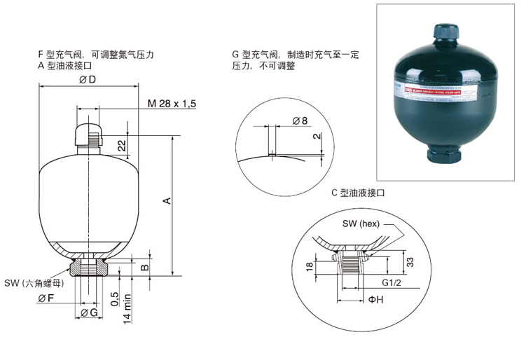 ELM1-210/00/AF,ELM1-210/00/CF,ELM1.4-210/90/AF,ELM1.4-210/90/CF,隔膜式蓄能器