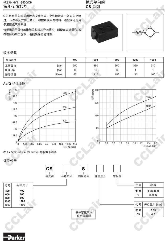 詳細(xì)信息 CS400S,CS600S,CS800S,CS1200S,CS1600S,CS400SV,CS400S65,CS400S65V,Parker板式單向閥