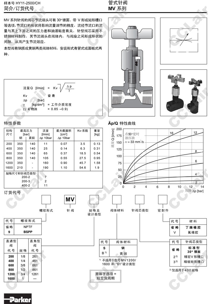詳細信息 MV200,MV400,MV600,MV800,MV261,MV461,MV661,MV861,MV1261,MV200S,MV261S,Parker管式針閥